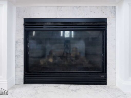 We reimagined their living space with custom millwork, crisp white trim, and a refined color palette that enhances natural light. The redesigned fireplace became a stunning focal point, framed by built-in cabinetry and marble accents for a timeless look. Every element—from the curved staircase to the symmetrical finishes—was crafted to exude elegance and balance.